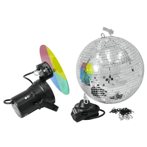 Discopallosetti pinspot-valolla: Kaiken kruunaa klassinen 30 cm peilipallo moottoreineen, joka tuo tilaan aitoa nostalgiaa ja glamouria. Kohdistettu valo ja värikiekko luovat tuhansia liikkuvia pisteitä ympäri huonetta.